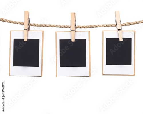 Blank Polaroid frames on a rope with clothespins, isolated on a white background, perfect for photo display or customization.
