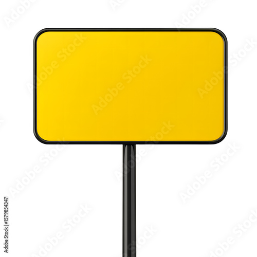 Blank rectangular yellow traffic sign with rounded corners on a metal pole isolated on transparent background