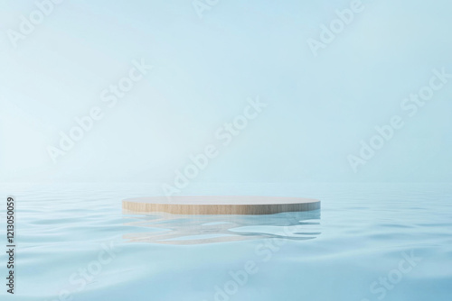 Blank Round Wooden Podium in Water on Blue Background Product Presentation Stand Mockup Minimalism