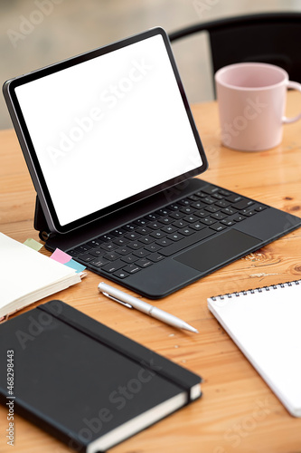 Blank screen portable tabet with magic keyboard on wooden table.