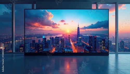 Blank screen reflecting cityscape, empty room, alone, technology, empty