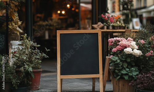 Blank shop sign or menu board near the entrance to flower shop or cafe. Blackboard sign mockup in front of a restaurant. Signboard, freestanding A-frame blackboard