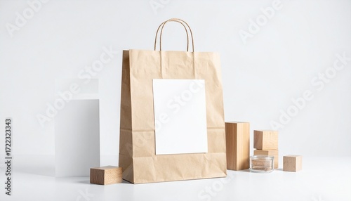 Blank shopping bag and small boxes with a white label for product packaging and branding mockups on a clean white background
