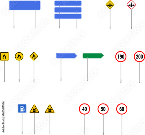 Blank signs for information of road direction, maps, text or banner. Road sign in realistic style isolated on white background. Danger blank warning empty sign.