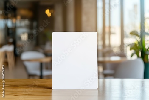 Blank square card mockup on wooden table in cafe