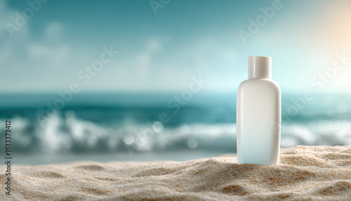 Blank Sun cream bottle on sandy beach with ocean background. Product mock up template
