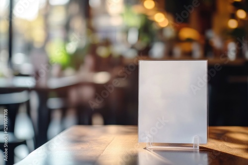 blank white acrylic menu holder sits atop an empty table in the foreground, with a blurred restaurant background.