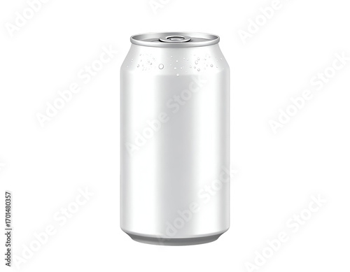 Blank White Aluminum Beverage Can with Condensation. Cold unbranded soda can with water droplets, isolated on black, for product mockups and advertising.
