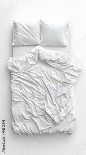 Blank white bed mock up, top view isolated on white background. Empty blanket and pillows mockup in bedstead