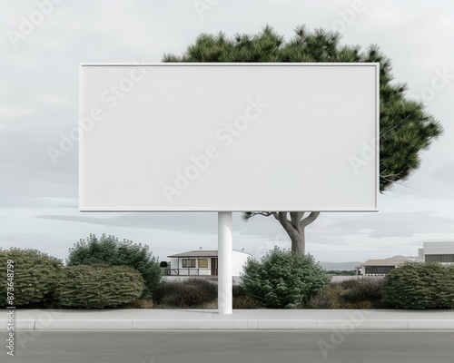 Blank white billboard on city street in front of trees and houses, ready for customized advertising, with a clear sky background.