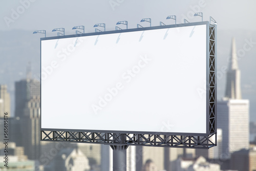 Blank white billboard on cityscape background at daytime, perspective view. Mock up, advertising concept