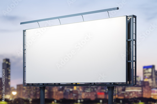 Blank white billboard on cityscape background at evening, perspective view. Mock up, advertising concept