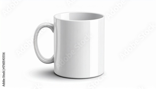 Blank white ceramic coffee mug isolated on a clean white background with subtle shadow, perfect for branding mockups and product presentations.