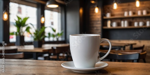 blank white coffee mug mockup on wooden table blurred cafe interior background product display template.
