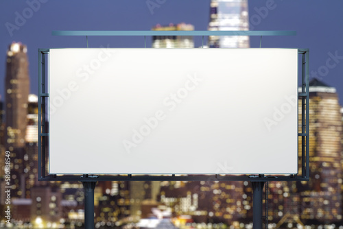 Blank white horizontal billboard on skyline background at evening, front view. Mock up, advertising concept