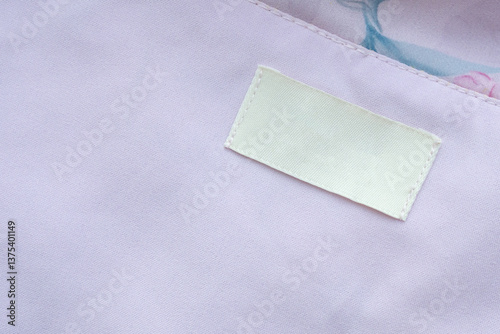 Blank white laundry care clothes label on purple shirt fabric texture background