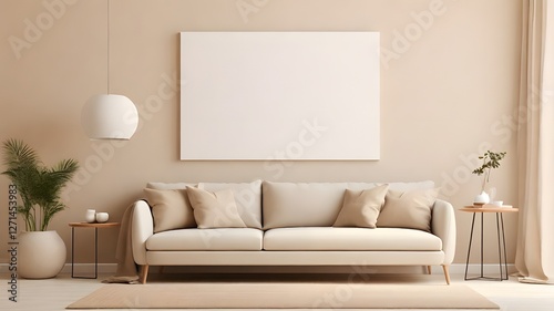 Blank white modern canvas art mockup against a soft beige living room wall, minimalist furniture, and a light brown sofa background