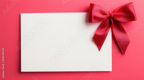 Blank white paper gift card with red bow on top right on pink background. Concept for Wedding or Valentine card, Invitation, Romantic, Love letter