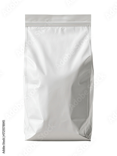 Blank white plastic pouch. A plain, white, plastic bag, likely for food or other products. Zipper closure. Front and back