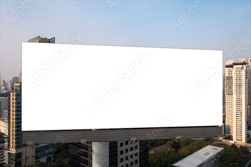 Blank white road billboard with Bangkok cityscape background at sunset. Street advertising poster, mock up, 3D rendering. Front view. The concept of marketing communication to promote or sell idea.