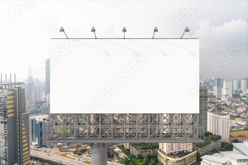 Blank white road billboard with KL cityscape background at day time. Street advertising poster, mock up, 3D rendering. Front view. The concept of marketing communication to promote or sell idea.