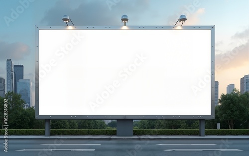 Blank white road billboard with KL cityscape background at day time. Street advertising poster, mock up, 3D rendering. Side view. The concept of marketing communication to promote or sell idea.
