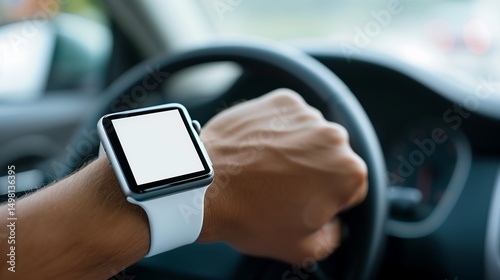Blank white screen smart watch worn on the wrist of a man holding a car steering wheel,finger,hand,blank