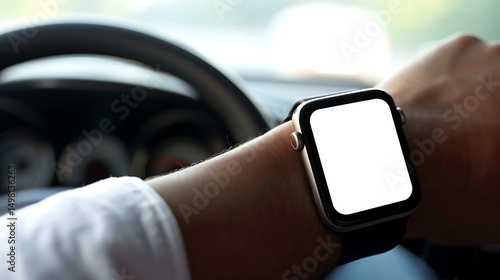 Blank white screen smart watch worn on the wrist of a man holding a car steering wheel,woman,wheel,driver