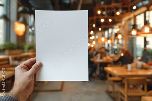 Blank white sheet of paper held in hand at cozy cafe - Mockup concept for menu, flyer, or branding design in warm restaurant setting