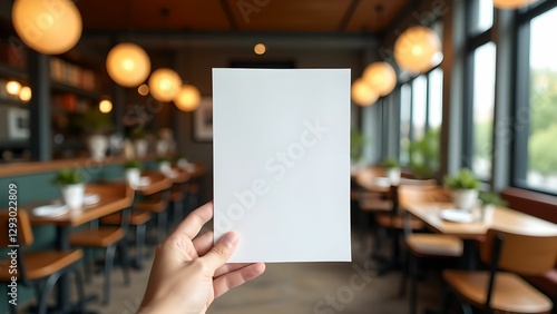 Blank white sheet of paper in hand in cozy cafe with warm lighting