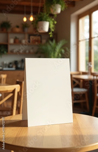 Blank white sign stands on round wooden table in cafe interior. Empty space for text or menu. Natural light streams through window, illuminating indoor plants and seating.
