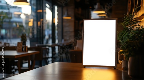 Blank white signboard on a wooden table in a restaurant with ambient lighting suitable for menu or promotional advertising display