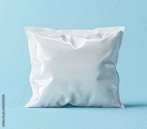 Blank white square food packaging, smooth, glossy surface, crispy snack, ready to be printed, studio shot, light blue background