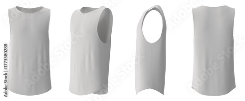 Blank white tank top mockup, front, side, and back views, isolated on white.