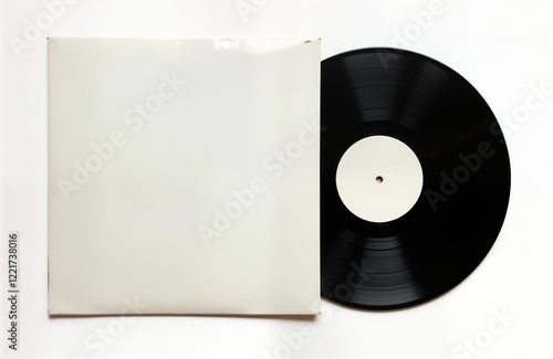 Blank white vinyl record album cover, black vinyl disc on white background. Retro music design. Empty template for music album cover label design. Ideal for advertising branding. Stylish presentation