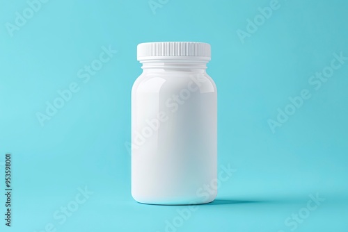 Blank white vitamin bottle. Unlabeled white nutritional supplement jar on blue backdrop, custom branding, dietary product mockup, clean medicine bottle design. Generative Ai
