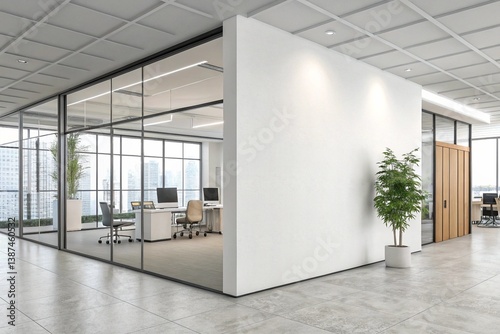 Blank white wall mockup in a modern office interior. 3D Rendering