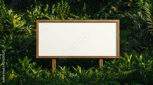 Blank Wooden Billboard Surrounded by Lush Greenery and Plants