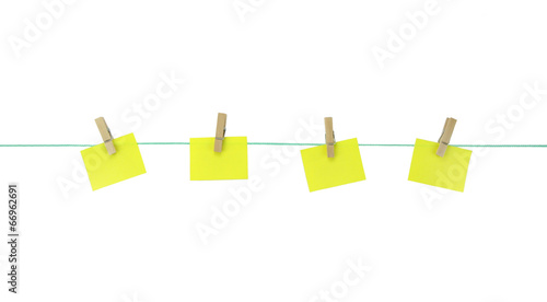 Blank yellow note papers hanging with wood pegs on clothesline.