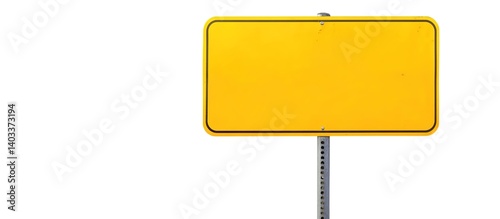 Blank yellow rectangular traffic sign on metal pole against pure white background, minimalist industrial design with high-contrast geometry.