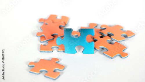 blaues Puzzel Teil vor einer Gruppe von organgen Puzzleteilen