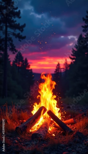 Blazing campfire under a vibrant summer sky, crackling flames casting warm light against the night Perfect for summer, camping, warmth, and nature themes , red, tranquil