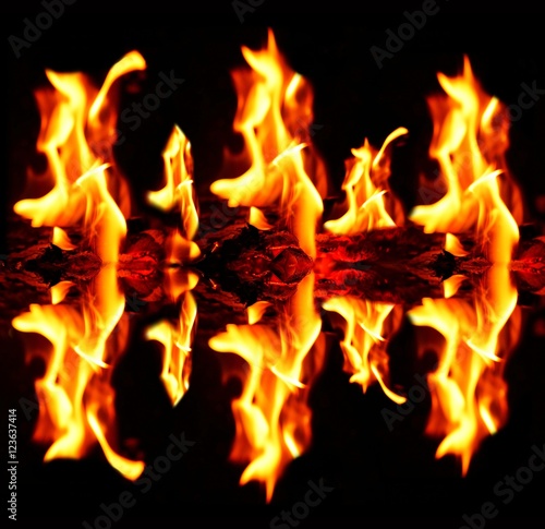 Blazing fire flames with reflection on dark black background.