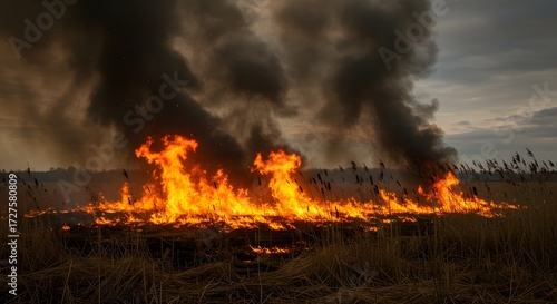 Blazing Inferno in Nature's Embrace: An ominous scene unfolds as a ferocious fire consumes a dry grassland, with towering flames and dark, billowing smoke.