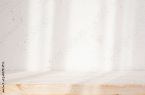 Bleached wood table top and abstract blurred plaster wall with shadows from window sunlight as background