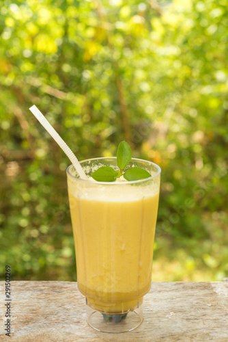 Blended smoothie with ingredients on wooden table. yellow juice on green leaves background. Fresh organic smoothie, healthy drink with fresh fruit.