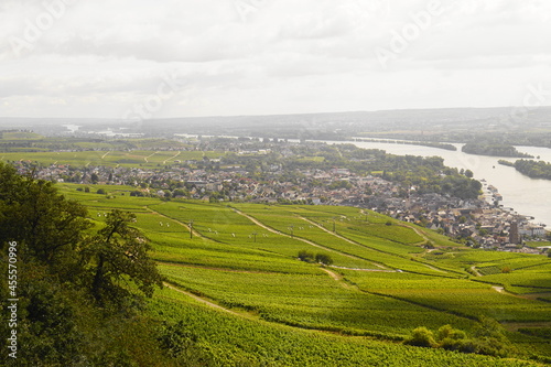 Blick auf Rüdesheim vom Niederwalddenkmal aus und ein Blick auf die Weinreben im Rheingau am Rheinsteig