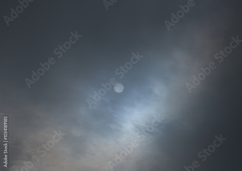 Blick in die Sonne bei Bewölktem Wetter mit Nebel, Abgeschwächte Sonne bei schlechtem Wetter, wenig Sonneneinstrahlung