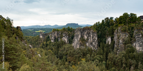 Blick von der Pavillionaussicht zu den Wehltürmen und der Felsenburg Neurathen in der Sächsischen Schweiz