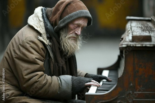 Blind destitute old dirty beggar with beard playing the piano. Homeless man with a musical instrument. Ai generated